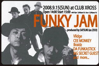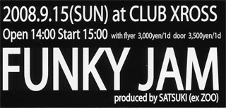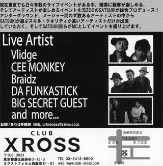 Open 14:00 Start 15:00 with Keitai flyer 3,000yen / 1D door 3,500yen / 1D FUNKY JAM produced by SATSUKI (ex ZOO) funkyegges@yahoo.co.jp LIVE: Vlidge CEE MONKEY Braidz DA FUNKASTICK ★BIG SECRET GUEST and more.... 3-13-3 Nishi-Azabu, Minato-ku, Tokyo Tel. 03.5413-8600 info: funkyegges@yahoo.co.jp Website: www.club-xross.com ・当店には専用駐車場はございません。お車でのご来店はご遠慮下さい。 ・混雑時ご入場を制限させていただく場合がございます。 お早めのご来店をお待ちしております。 |